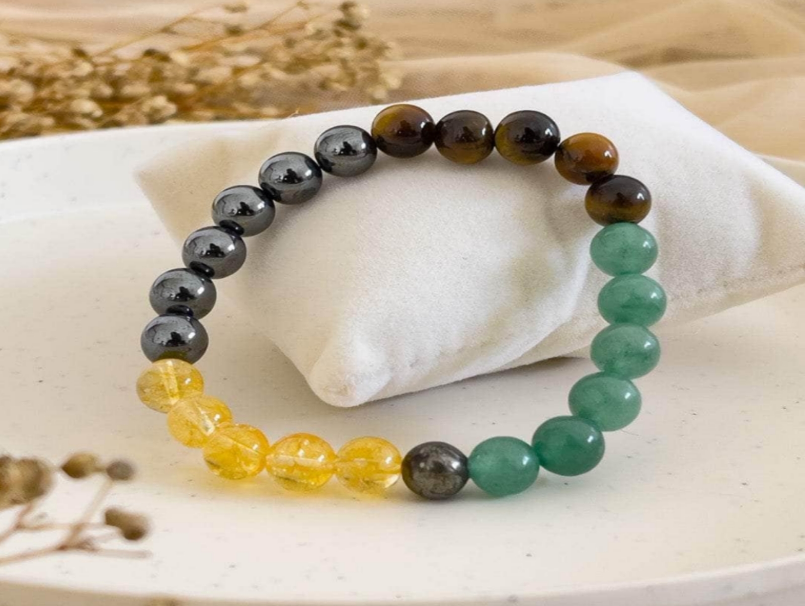 Money magnet bracelet is made by mixing all these Gem stones. In which the way each stone works is different. Black Obsidian – ( provides protection from negative energy. ) And Pyrite – ( is considered the stone of wealth and prosperity. ) and so is Green Aventurine – ( is used for luck and growth, helps in increasing career and financial opportunities. ) And Tiger Eye – ( Confidence aur decision-making ) strong karta hai. And among all these stones, pyrite is considered to be the most powerful stone. That is why this bracelet is called a money magnet.